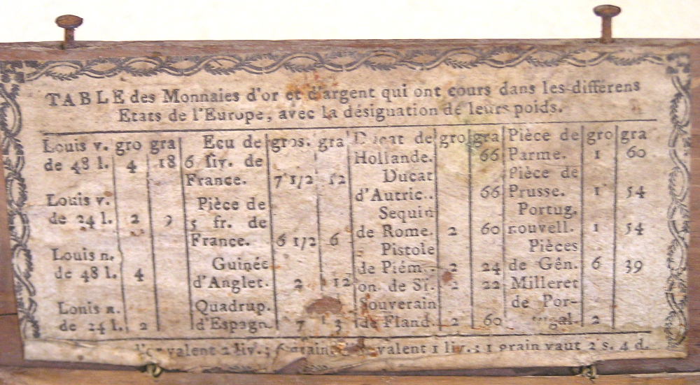 couvercle de la boite de leur balance une "Table des Monnaies".