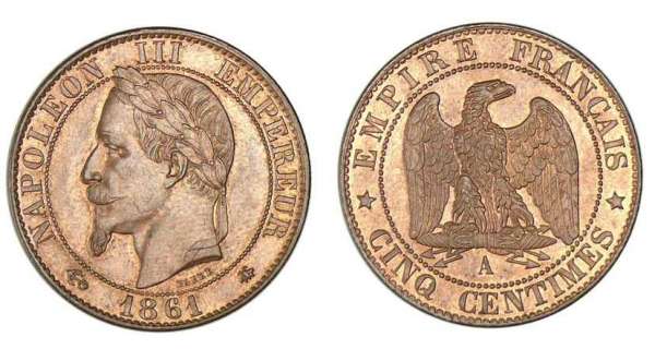 La découverte d'or en Californie et en Australie (1848 à 1851) ayant entrainé une légère baisse du cours de l'or par rapport à l'argent, le titre des pièces de 20ct et 50ct est abaissé à 835‰ dés 1864. On passe alors des types Napoléon "tête nue" à ceux dit "tête laurée" entrainant la disparition des divisonnaires tête nue 900‰ qui sont refondus en masse (par les spéculateurs et les ateliers de la Monnaie). Dans un premier temps la France ne baisse pas le titre de ses pièces de 1fr et 2fr, ce qui n'empêche pas les autres pays de le faire. La création de l'Union Monétaire Latine le 23 décembre 1865 qui permet la circulation de monnaies entre la France, la Belgique, l'Italie et la Suisse, oblige la France à baisser aussi le titre de ses pièces de 1fr et 2fr dés 1866. On passe des types Napoléon tête nue à tête laurée et les premiers seront refondus en priorité d'ou leur rareté aujourd'hui. Un problème toutefois : cinq pièces de 1fr ne sont plus équivalentes à une pièce de 5fr qui reste à 900‰! La quantité d'argent fin contenu dans les 5fr n'étant pas modifiée, elle est à ce moment là supérieure à la valeur faciale. Ces pièces seront donc, elles aussi, largement refondues d'ou leur rareté relative, surtout en bon état.