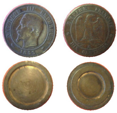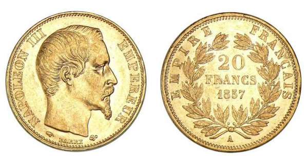 La découverte d'or en Californie et en Australie (1848 à 1851) entraine une légère baisse du cours de l'or par rapport à l'argent. Cette baisse va favoriser la création d'une pièce de 5fr or. Les pièces de 5fr "petit module" (premières pièces de 5fr en or) et surtout les 10fr seront largement refondues lors du passage au grand module. Ceci explique leur relative rareté. Vous trouverez dans le lien suivant un texte concernant le retrait des pièces de 5fr "petit module" (Bulletin numismatique n°31). On constate que ce retrait date de 1859 alors que les pièces au grand module circulent depuis 1855! Malheureusement on y parle pas des pièces de 10fr. ---------- La 10fr petit module de 1853 A est à tranche lisse, celle de 1854A existe avec tranche lisse ou striéee, et le millésime 1855 A est uniquement à tranche striée. Une 10fr 1856A de taille intermédiaire et de poids faible est décrite dans le Forum des Amis du Franc (www.amisdufranc.org). Attention aux différences de taille du "BB" en 10fr pour 1860 car certaines variétés sont rares. Il existe des faux en platine pour les