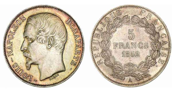 Pièce assez courante, même en bon état de conservation. Le millésime 1852A est le seul à ce type. La frappe à lieu en 1853 mais au millésimme 1852 pour marquer la prise de pouvoir de Louis Napoléon Bonaparte le 2 décembre 1852.