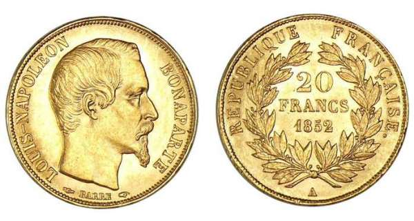 Pièce assez courante, même en bon état de conservation. Le millésime 1852A est le seul à ce type. La frappe à lieu en 1853 mais au millésimme 1852 pour marquer la prise de pouvoir de Louis Napoléon Bonaparte le 2 décembre 1852.