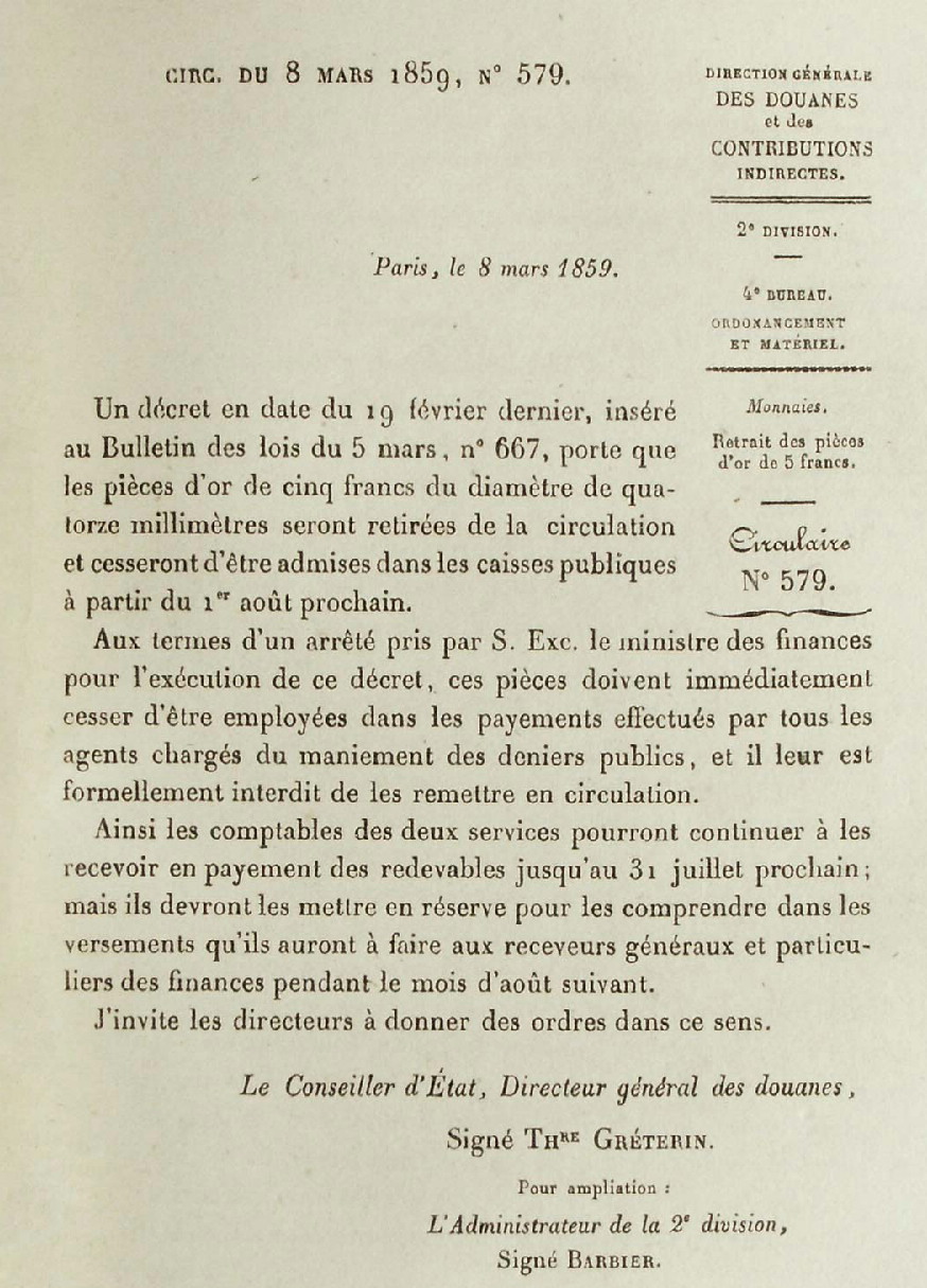 La découverte d'or en Californie et en Australie (1848 à 1851) ayant entrainé une légère baisse du cours de l'or par rapport à l'argent, le titre des pièces de 20ct et 50ct est abaissé à 835‰ dés 1864. On passe alors des types Napoléon "tête nue" à ceux dit "tête laurée" entrainant la disparition des divisonnaires tête nue 900‰ qui sont refondus en masse (par les spéculateurs et les ateliers de la Monnaie). Dans un premier temps la France ne baisse pas le titre de ses pièces de 1fr et 2fr, ce qui n'empêche pas les autres pays de le faire. La création de l'Union Monétaire Latine le 23 décembre 1865 qui permet la circulation de monnaies entre la France, la Belgique, l'Italie et la Suisse, oblige la France à baisser aussi le titre de ses pièces de 1fr et 2fr dés 1866. On passe des types Napoléon tête nue à tête laurée et les premiers seront refondus en priorité d'ou leur rareté aujourd'hui. Un problème toutefois : cinq pièces de 1fr ne sont plus équivalentes à une pièce de 5fr qui reste à 900‰! La quantité d'argent fin contenu dans les 5fr n'étant pas modifiée, elle est à ce moment là supérieure à la valeur faciale. Ces pièces seront donc, elles aussi, largement refondues d'ou leur rareté relative, surtout en bon état.